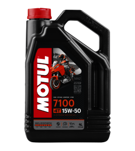 MOTUL 7100 15W50 4T – 100 % sintetinė variklio alyva, Ester technologijos pagrindu. Sukurta aukštos klasės keturtakčiams motociklų varikliams, suderinama su šlapia ar sausa sankaba ir moderniomis išmetimo sistemomis.